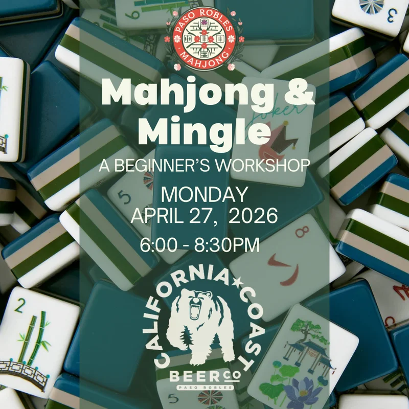 Paso Robles Mahjong and California Coast Beer Co. invite you to join us for Mahjong & Mingle: A Beginner’s Workshop—a relaxed and friendly evening where everyone is welcome. Whether you’ve never played or just want to brush up on the basics, this is a great place to start. We’ll learn together, share a few laughs, and enjoy the simple joy of gathering around the table. Come as you are, bring a friend if you’d like, and discover how fun and social Mahjong can be—no experience needed.